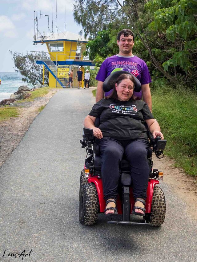 At 9am, Rebecca met supporters at the Noosa Spit to trial a new all-terrain wheelchair that will allow her to return to the beach she once walked daily with her son.
